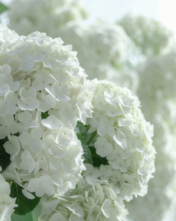 A beautiful arrangement of white hydrangea blooms against a soft blue background, evoking a sense of tranquility and natural elegance. Perfect for spring decor.