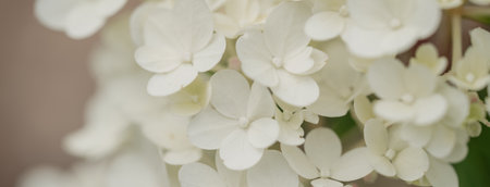 Wide view of a white hydrangea bloom with delicate petals. Soft and delicate image, perfect for adding a touch of natural beauty. Copy space