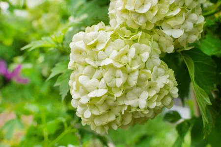 Viburnum vulgaris buldenezh. Hydrangea. White flowers on a green bush.