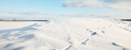 Panoramic view of the country snow-covered field, snowdrifts with human and car tracks. Winter rural scene. Christmas, travel, logistics, dangerous driving, off-road, transportation, remote places