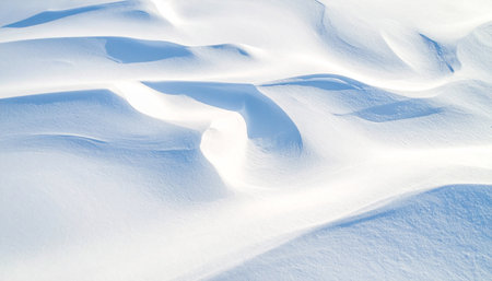 Undulating snowdrifts with subtle shadows under bright sunlight creating a textured winter landscape