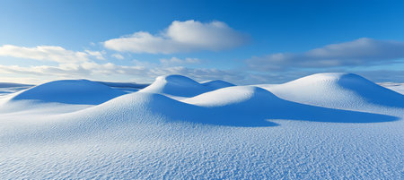 Photography captures a smooth snowy hill with soft curves under a bright winter sky, evoking a peaceful atmosphere and ideal for seasonal inspiration