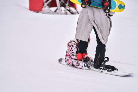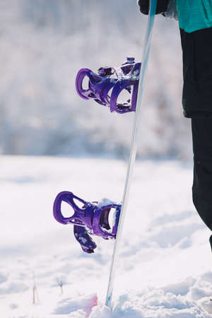 Leisure, sport concept - amateur snowboarder holding her board on snowy slope