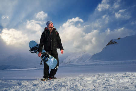 man, snowboarder with a snowboard in hand is on the snow in the mountains, Caucasus, athlete