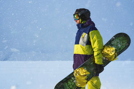 Snowboarder carries a board in the hands. Evening snowfall in the mountains.