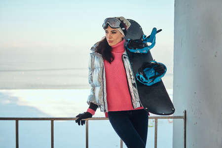 woman winter outdoor snowboarding concept. Young woman holding snowboard on her shoulders, she's looking away and smiling, copy space, close up