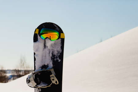 Woman snowboarder in bright suit in a sports glasses holds a snowboard. Extreme sports. Leisure.