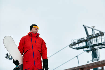 Male snowboarder in a red suit walking on the snowy hill with snowboard, Skiing and snowboarding concept