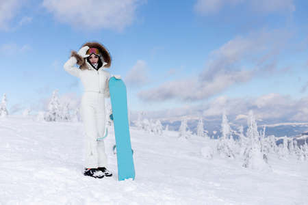 Young active woman with snowboard is posing for photographer at bright winter day.