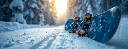 Snowboard and boots are set on fresh snow as the sun sets behind the mountains. The warm glow creates a stunning view of the winter landscape.