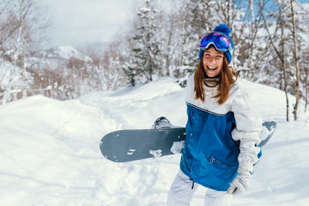 happy smiling young woman with snowboarding on the mountain in winter.