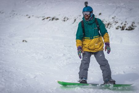 Active man snowboarder riding on slope during beautiful sunny day in the ountains.