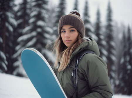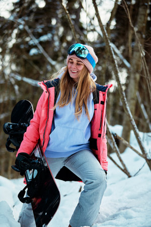 Portrait of a young woman snowboarder in bright winter clothes. A female of Caucasian ethnicity spends time in a snowy snowboard park. Winter vacation outdoors.