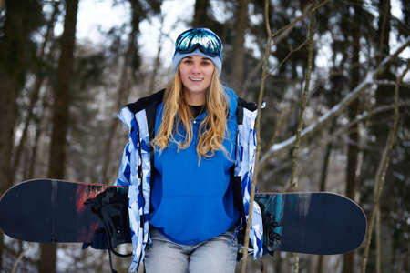 Young active woman with snowboard is posing for photographer at bright winter day.