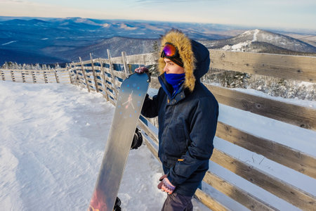 Man with a snowboard standing on a mountain on the background of the winter forest. Winter leisure activity. Healthy lifestyle. Extreme sports.