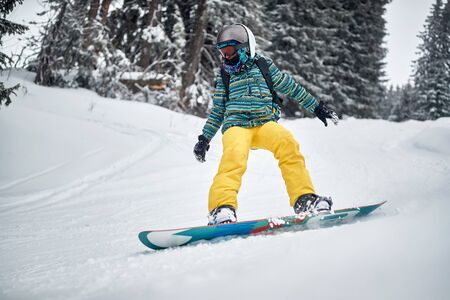 Altai, Russia - 01.01.2020: A man snowboarder slides down the mountain over white snow in a sports tourist base Turquoise Katun. Seasonal sports.