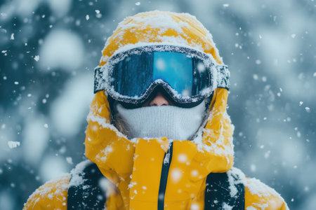 Dressed for cold, a person in a bright yellow jacket and ski goggles stands in a snowy landscape, ready for winter exploration or sport.