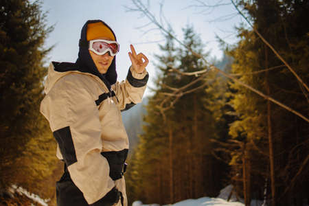 Young man wearing a ski helmet and goggles stands in a snowy forest