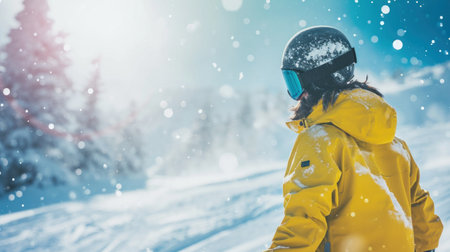 Young woman snowboarder looking at mountains in winter on ski resort