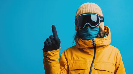 Woman in a yellow jacket with a joyful smile, holding a snowboard against a vibrant blue background