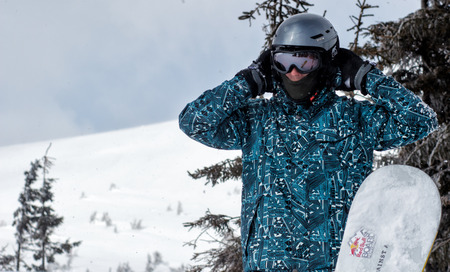 Successful young man snowboarding in the mountains Sheregesh. Snowboarder resting on mountain top. Caucasian snowboarder on a background of blue sky. Stylish caucasian snowboarder. ski resort