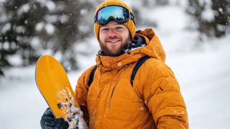 Portrait of a happy, smiling male snowboarder against the backdrop of snow-capped mountains at a ski resort, during winter holidays. Concept of traveling around the world, recreation winter sports vacations tourism in the mountains and unusual places