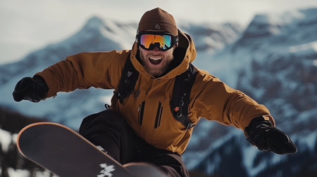 A thrilling snowboarding adventure unfolds in a stunning mountain landscape, showcasing a snowy slope, clear skies, and breathtaking panoramic views.