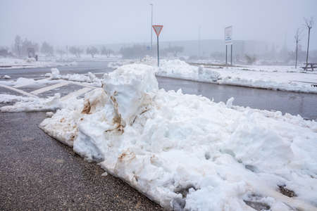 Melting snow, frost and weather. Parking and traffic. Urban environment