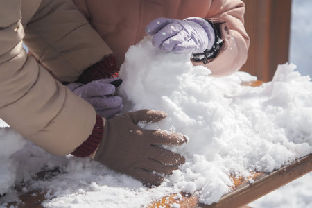 close up of adult cleaning snow from sidewalk and using snow shovel after heavy snowstorm