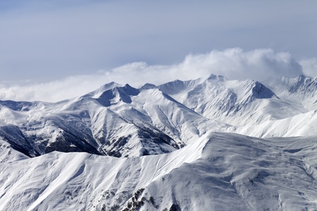 Panoramic view on high snowy mountains and blue sky with clouds at sunny winter day. Caucasus Mountains, Georgia region Gudauri.