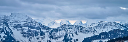 Panoramic view of the snowy mountains in the clouds. Switzerland