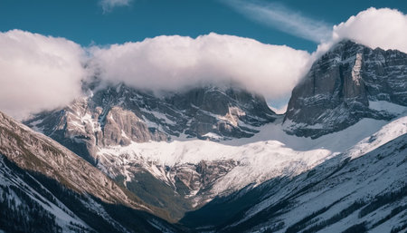 majestic mountain range shrouded in misty clouds, with snow-capped peaks visible, created with generative ai