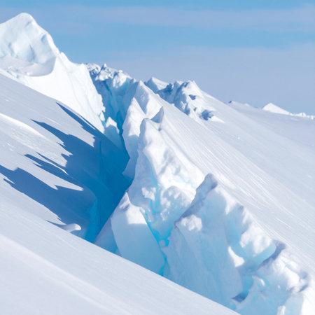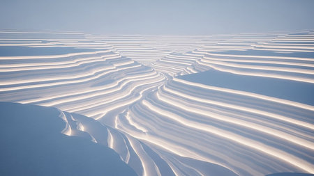 An abstract landscape of layered snow formations with glowing white lines against a soft blue sky.