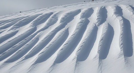 Wind-sculpted snow drifts creating wavy patterns on a snowy slope in a winter landscape.