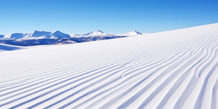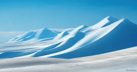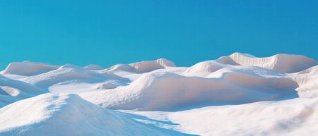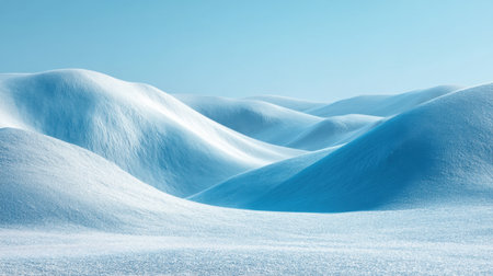 An image showcases a snow-covered mountain range under a clear, bright blue sky. The composition emphasizes the rolling hills and textured snow. The scene suggests a cold environment, possibly during the day. Suitable for various editorial and commercial applications.