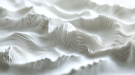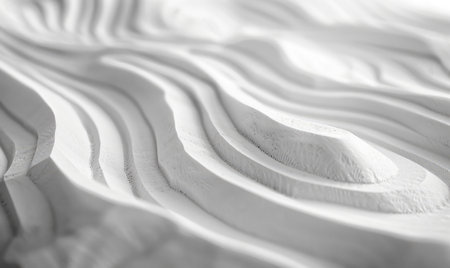 Abstract white terrain with contoured layers creating a topographical pattern, showcasing minimalist and modern aesthetics. Ideal for concepts like simplicity, purity, and innovative design.