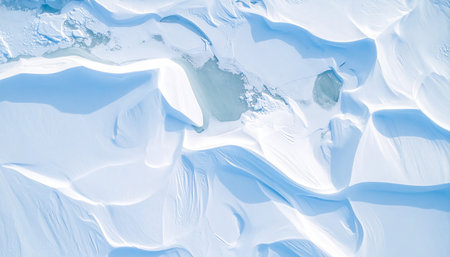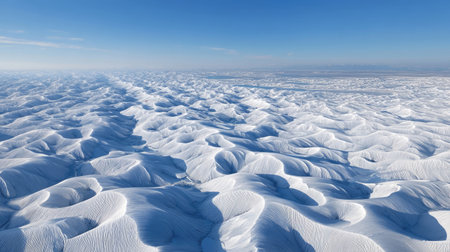 An aerial view presents a vast snowy landscape under a clear blue sky. The textured snow surface shows undulating patterns formed by wind. The image displays a day scene with bright natural light, offering a wide perspective. Suitable for various editorial and commercial projects.