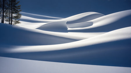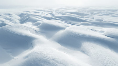 A serene winter scene featuring softly sculpted snow formations shimmering beneath gentle daylight, with elegant shadows and faint blue tones enhancing the tranquil