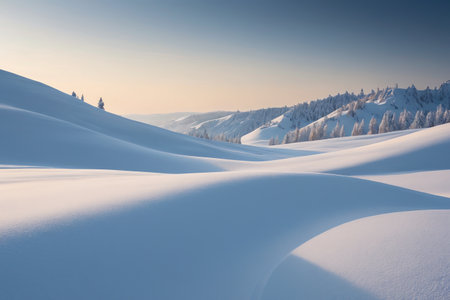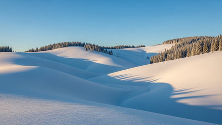 Soft, snowy hills create a serene winter landscape under a clear blue sky. This tranquil scene captures the beauty and simplicity of nature's winter wonderland.