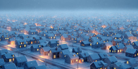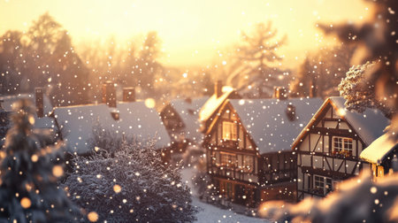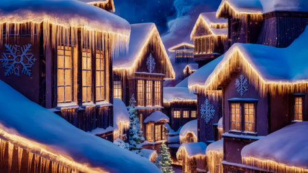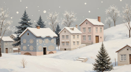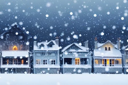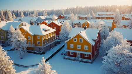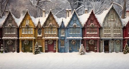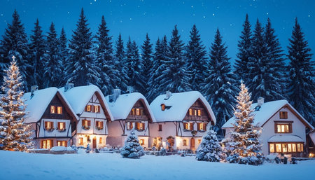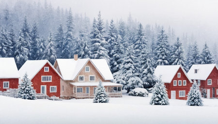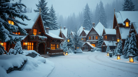 Picturesque snowy town with cozy houses and festive winter atmosphere.