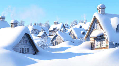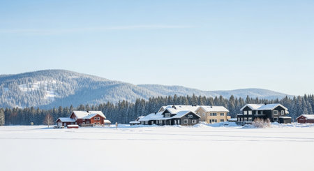 A tranquil winter scene featuring charming houses blanketed in pristine snow. The landscape offers a peaceful escape, complete with blue skies and a serene atmosphere.