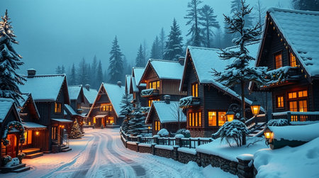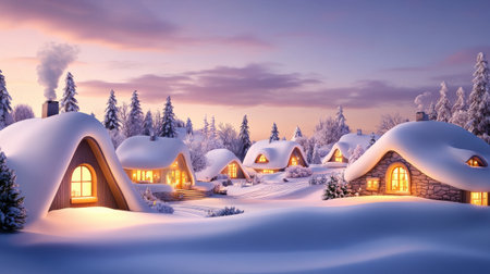 Charming snow-covered village illuminated at dusk with cozy homes nestled in a winter wonderland setting. Generative AI