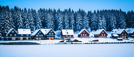 A serene winter scene showcasing cozy cottages blanketed in snow, nestled in a peaceful village. The tranquil landscape captures the charm of rural life in winter.