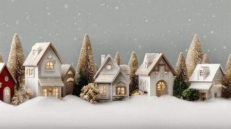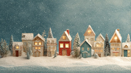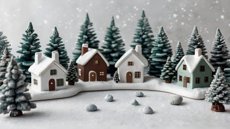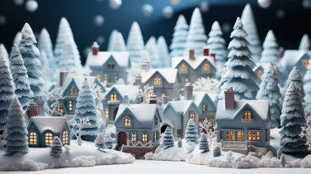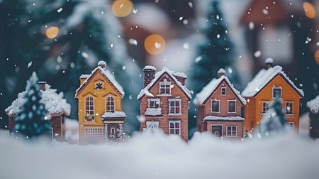 Charming miniature wooden houses nestled in a snowy winter scene. Festive and cozy holiday decor.