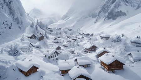 thick snow covering an entire resort with tiny cabin roofs poking out, created with generative ai