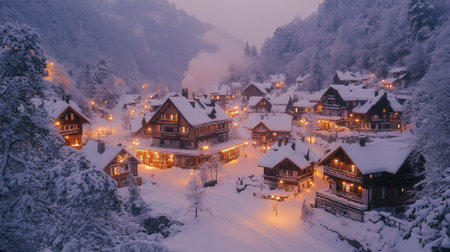 This stunning aerial image showcases a snow-covered village at dusk, with warm lights illuminating the charming rooftops, creating a serene winter wonderland atmosphere.