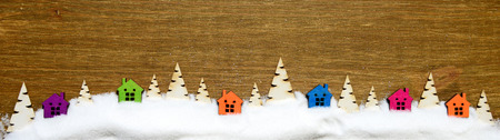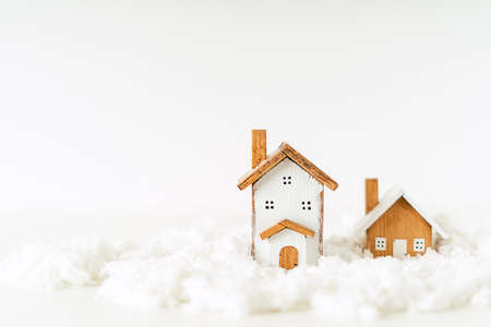 Christmas and New Year holiday background. Festive decoration with small wooden houses in snow. Festive concept.