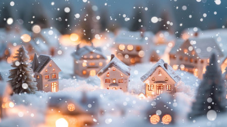 Miniature Christmas village houses covered in snow with festive lights, Winter holidays background.