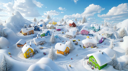 A picturesque winter village scene showcasing colorful houses blanketed in snow, surrounded by trees and a stunning blue sky, creating a cheerful atmosphere.