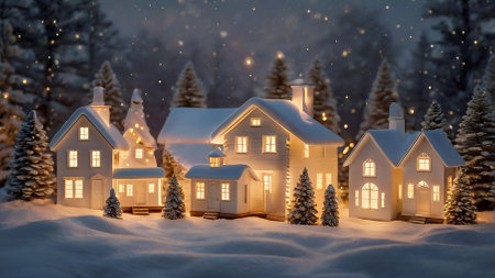 Snow-covered village with quaint cottages, softly glowing windows, and snow-draped rooftops, creating a serene winter atmosphere.